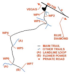 Note: along this section (WP3-WP4) of the trail which often looks like a shallow wash there are many use-trails, stay on a path which parallels NV-159 (see map below).