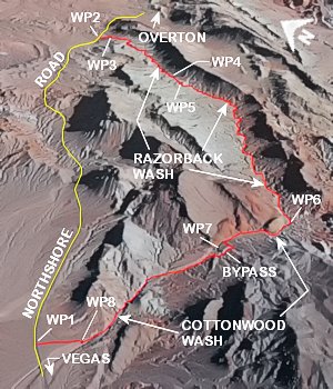 From the intersection of NV-564 (E. Lk. Mead Pkwy.) and NV-167 (Northshore Rd.) within Lk. Mead National Recreation Area head North on Northshore Rd. for 18.2 miles+- to a paved pullout (waypoint WP1) on the Left (North) side of the road.
