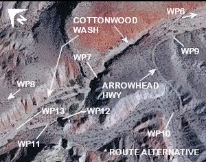 From WP8 "turn right" Northerly ascending a use trail to the North-Northeasterly "edge" of Cottonwood Wash then bear Northwesterly across open desert (no trail) to WP1, being 0.17 miles+- distant of WP8, and the end of this trail description.